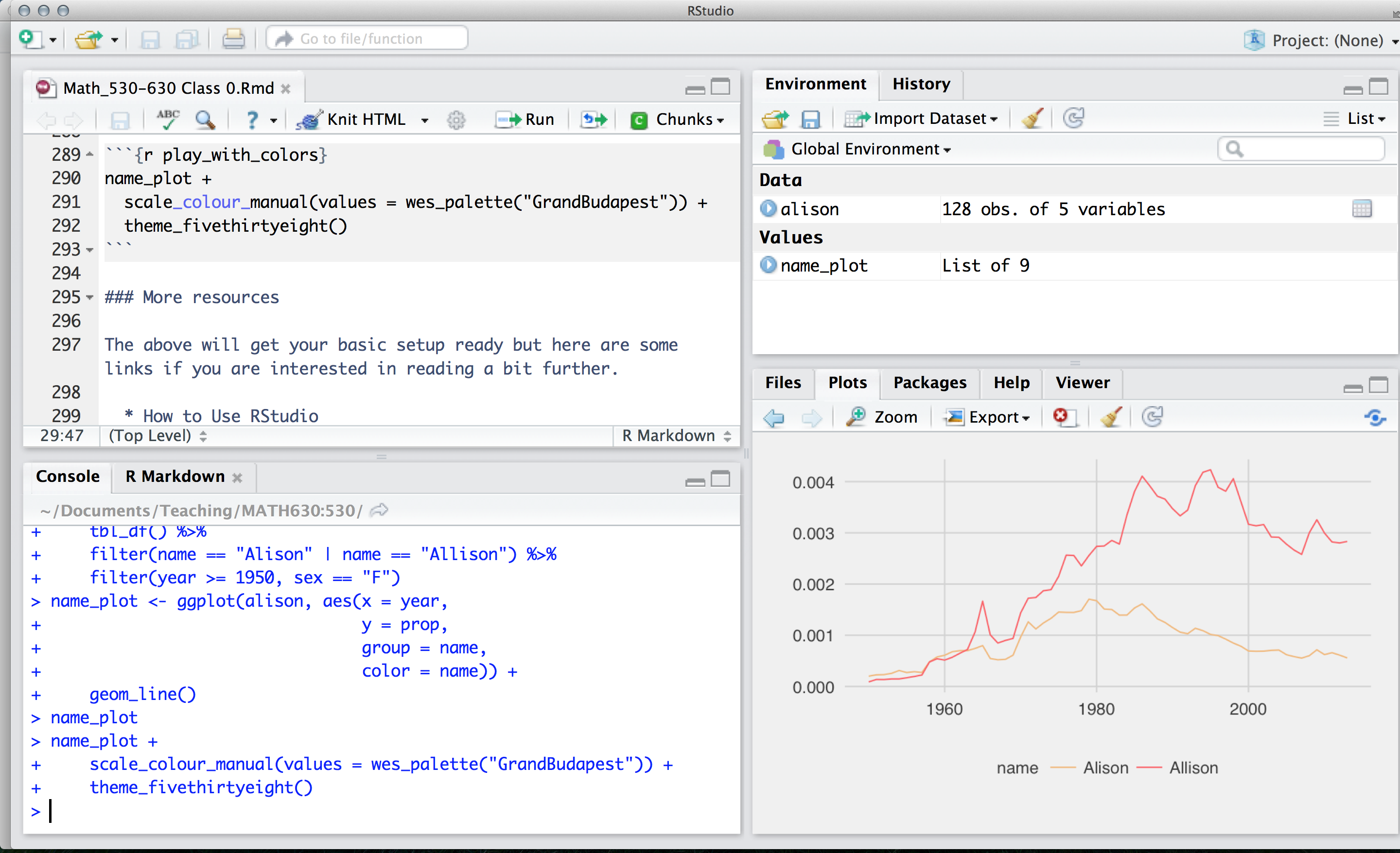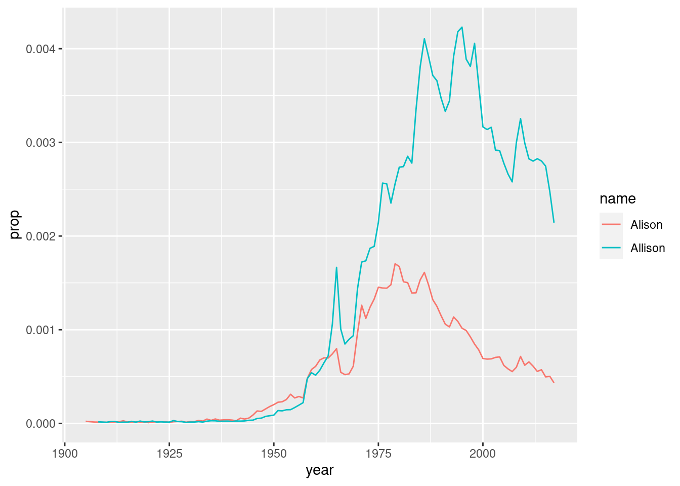 Edit the code above to create a new dataset. Pick two names to compare how popular they each are (these could be different spellings of your own name, like I did, but you can choose any two names that are present in the dataset). Make the new plot, changing the name of the first argument alison in ggplot() to the name of your new dataset.