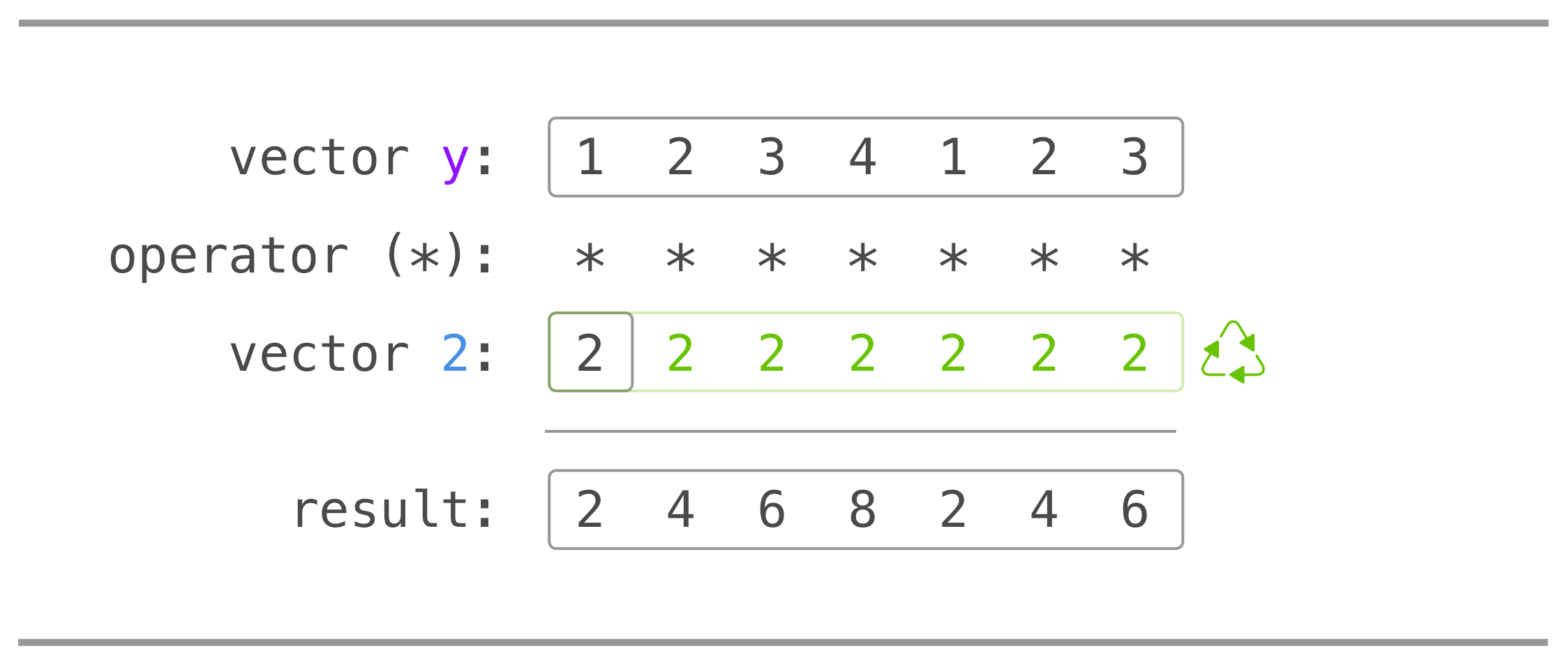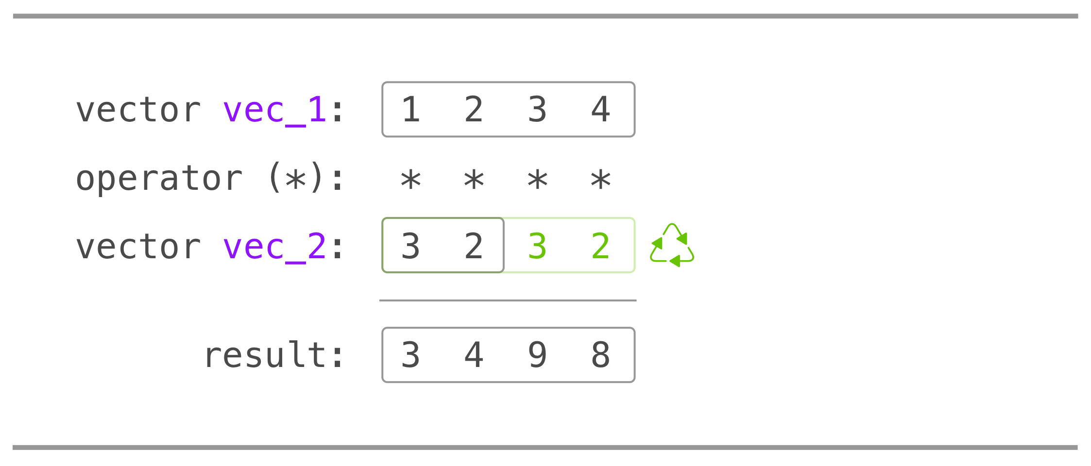 vec_1 and vec_2 matters, the order of multiplication doesn't matter (i.e., we could write vec_2 * vec_1 and expect the same answer but reversing vec_1 with rev() would result in a different answer). When given two vectors of the same length, R simply performs the specified arithmetic operation element-by-element. If the vectors are of different lengths, R recycles the shorter vector until it is the same length as the longer vector. Here is the vector schematic: