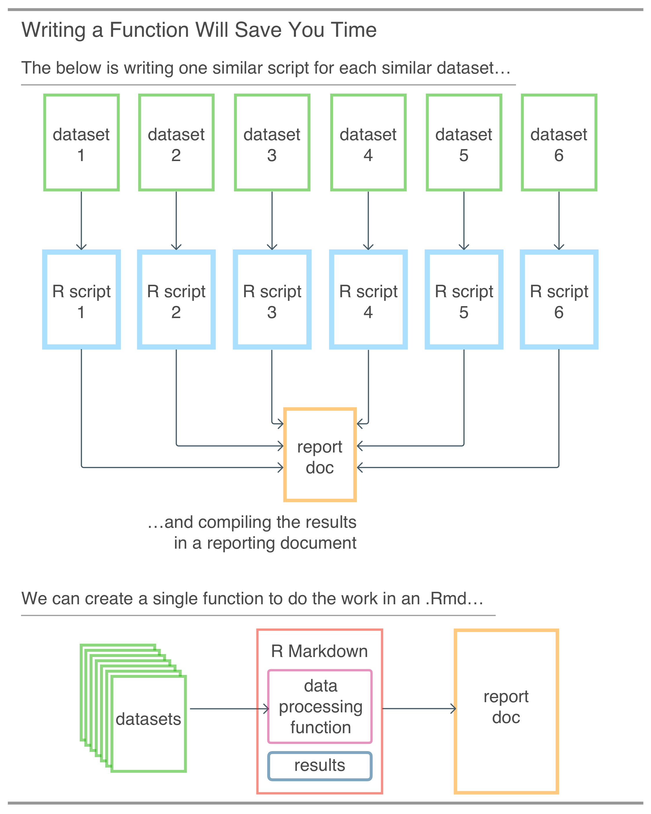 sales), groups it by date, and summarizes to get the order count, the items sold, and the total revenue by day. Finally, it arranges the summary by descending date. If that isn't enough, the resulting summary table is also returned by the function since it's the last statement in the function body! While this new function (with a new name: daily_sales()) looks like a radical departure from the sales_on_day() function, the output gives us more of what we want: important sales figures going back day by day. The name of the function was changed to better indicate what would be delivered from it. The input requirement has also changed. Each call of daily_sales() expects the sales data in the sales_table argument. As long as the structure of the table is maintained (i.e., column names and column data don’t appreciably change) this function will continue to work when new rows are added to that table. The expectation now is that every time the sales data is updated with new rows, the function can be called to give us the latest sales summary.