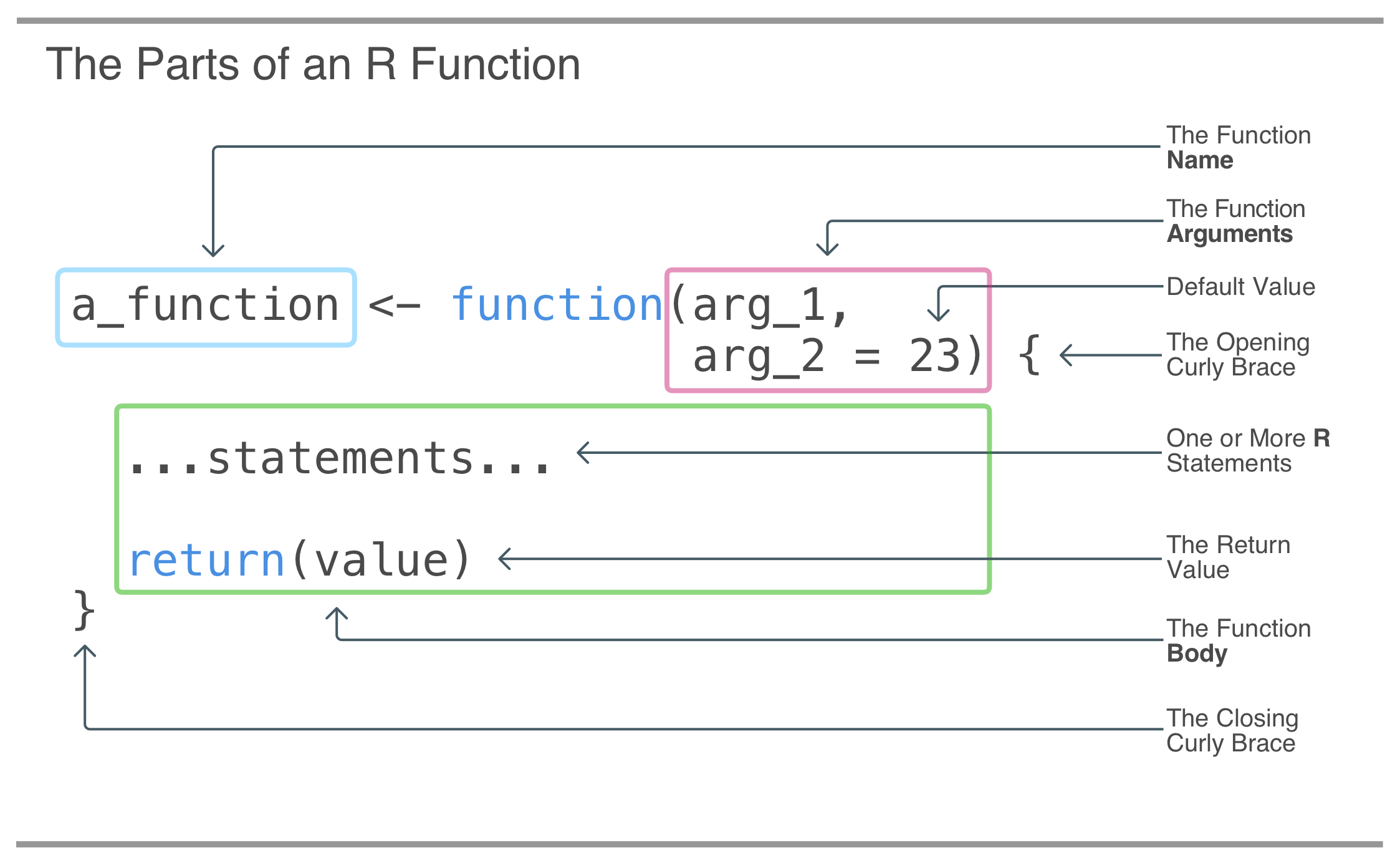 function(); functions usually have a name, they have a signature that often holds at least one argument, and they contain R statements in their function body - A value can be returned from a function by using an explicit